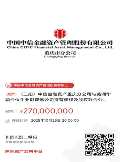 中國中信金融資產(chǎn)管理股份有限公司重慶市分公司(簡稱:中信金融資產(chǎn)重慶分公司)與蕪湖華融資本創(chuàng)榮投資中心(有限合伙)(簡稱:蕪湖華融合伙企業(yè))對重慶雙遠(yuǎn)實業(yè)(集團)有限公司(簡稱:雙遠(yuǎn)公司)持有債權(quán)及股權(quán),將于2025年10月25日20時至2025年10月26日20時在京東拍賣網(wǎng)通過公開競價方式進行處置,拍賣鏈接如下圖所示,現(xiàn)予以公告。